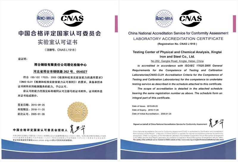 - The physical and chemical inspection center of Xingtai Steel passed the third time review of CNAS successfully and obtained laboratory approval certificate in new version with registration number of CNASL1918 and expiry date of Nov.20th, 2018.