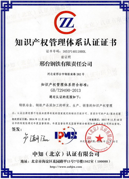 - Xingtai Steel apply for intellectual property rights management system certification that is audited and certificated by Zhongzhi (Beijing) certification co. Ltd according to GB/T29490-2013 from May to October in 2014. Xingtai Steel successfully passed this certification and got a certificate whic…