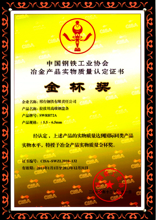 拉拔用高碳鋼盤條SWRH72A獲冶金產(chǎn)品實(shí)物質(zhì)量金杯獎