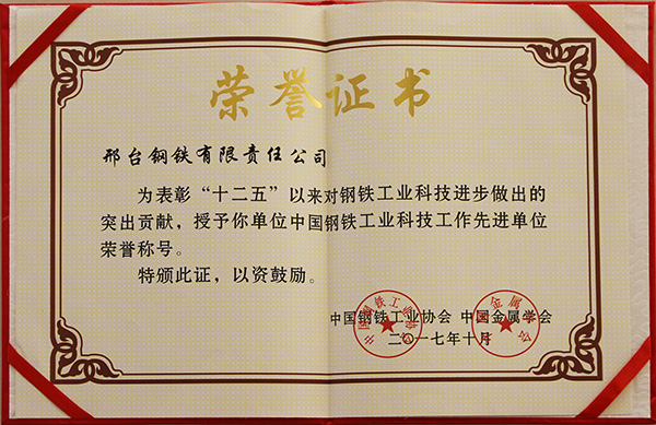 2017年10月,邢鋼被中國鋼鐵工業(yè)協(xié)會和中國金屬學(xué)會聯(lián)合授予“十二五”中國鋼鐵工業(yè)科技工作先進(jìn)單位榮譽稱號。