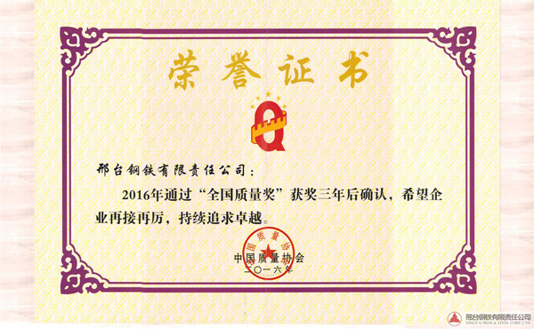 邢鋼于2013年獲得全國質(zhì)量獎,獲獎后邢鋼繼續(xù)實踐《卓越績效評價準則》,深入推進卓越績效管理模式,持續(xù)改進,不斷追求卓越。2016年9月全國質(zhì)量獎評審活動領(lǐng)導(dǎo)小組組織專家對邢鋼進行了全國質(zhì)量獎獲獎三年后的現(xiàn)場確認,通過專家小組的現(xiàn)場提問、材料匯報、生產(chǎn)現(xiàn)場的參觀,邢鋼順利通過了“全國質(zhì)量獎”獲獎三年后確認并頒發(fā)證書。