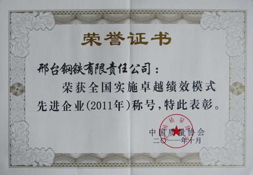 2011年10月,邢鋼榮獲“全國實施卓越績效模式先進(jìn)企業(yè)(2011年)稱號”。