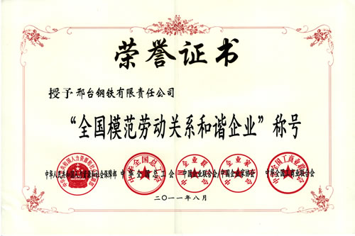2011年8月,邢鋼榮獲由人力資源和社會保障部、全國總工會、中國企業(yè)聯(lián)合會、全國工商聯(lián)頒發(fā)的“全國模范勞動關(guān)系和諧企業(yè)”榮譽稱號。
