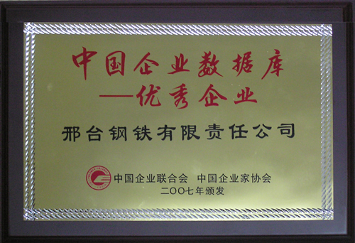 2007年12月,邢鋼榮獲由中國企業(yè)聯(lián)合會、中國企業(yè)家協(xié)會頒發(fā)的“中國企業(yè)數(shù)據庫優(yōu)秀企業(yè)”榮譽稱號。