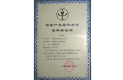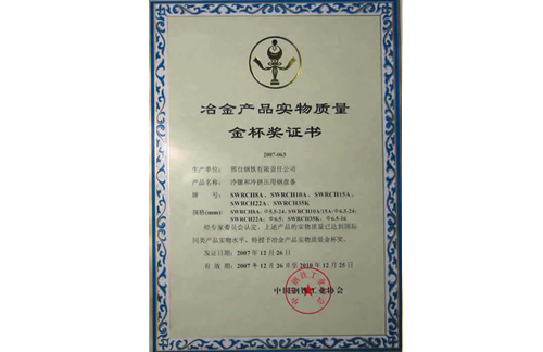 2007年12月,邢鋼冷鐓和冷擠壓用鋼盤條獲冶金產品實物質量金杯獎。