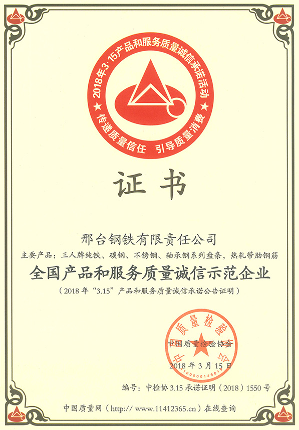 2018年3月15日,邢鋼(“三人牌”產(chǎn)品包括純鐵、碳鋼、不銹鋼、軸承鋼系列盤條和熱軋帶肋鋼筋)被中國質(zhì)量檢驗協(xié)會授予“全國產(chǎn)品和服務(wù)質(zhì)量誠信示范企業(yè)”稱號。