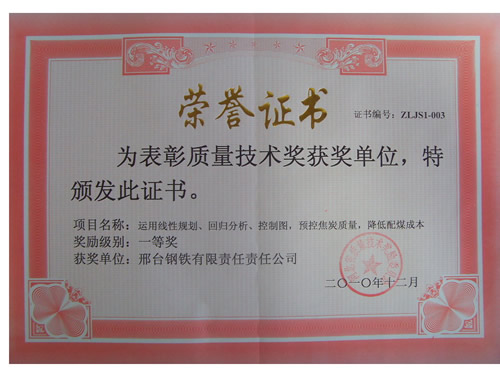 - 近日獲悉,我公司申報(bào)的“運(yùn)用線性規(guī)劃、回歸分析、控制圖預(yù)控焦炭質(zhì)量,降低配煤成本”質(zhì)量技術(shù)成果,經(jīng)河北省質(zhì)量技術(shù)獎(jiǎng)勵(lì)委員會評選,獲得一等獎(jiǎng)。該項(xiàng)目是焦化廠運(yùn)用質(zhì)量統(tǒng)計(jì)技術(shù)工具經(jīng)過實(shí)踐取得的一項(xiàng)質(zhì)量技術(shù)成果。通過實(shí)施該項(xiàng)目,配合煤成本比2008年降低了4775萬元,保持了焦炭質(zhì)量的持續(xù)穩(wěn)定。