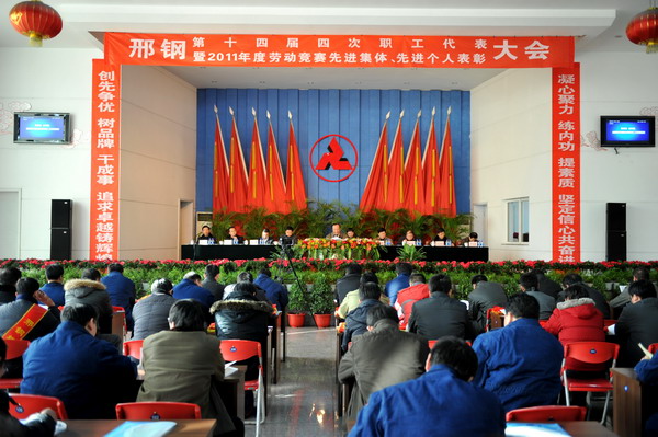 1月4日上午八時(shí),公司會(huì)議中心花團(tuán)錦簇,現(xiàn)場(chǎng)氣氛莊重?zé)崃?,在莊嚴(yán)的國(guó)歌聲中,公司第十四屆四次職工代表大會(huì)暨2011年度勞動(dòng)競(jìng)賽先進(jìn)集體、先進(jìn)個(gè)人表彰會(huì)隆重召開(kāi)。公司領(lǐng)導(dǎo)袁世臻、王春雨、張永藏、苑?,F(xiàn)、梁鋒、戴鶴祥、劉蘭宗、孔俊其、周兵晨、李喜山出席了會(huì)議。邢臺(tái)市總工會(huì)副主席宋起香應(yīng)邀到會(huì)并致詞。