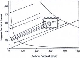 蒂森認(rèn)為的RH脫碳前的最佳鋼水成分,如上圖中“方塊”區(qū)域所示, RH脫碳前鋼水成分范圍控制在方框內(nèi)時(shí),鋼水脫碳處理后[C]、[O]均較低,將減少脫氧用鋁量,有利于提高鋼的純凈度。
