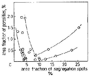 中心偏析與中心疏松不是線(xiàn)形關(guān)系,如下圖所示,中心疏松面積隨著中心偏析面積的減少而減少,是由于溶質(zhì)富集鋼液不容易滲透到凝固收縮中;中心疏松面積隨著偏析面積的增大而增大,溶質(zhì)富集鋼液容易滲透到凝固收縮中。