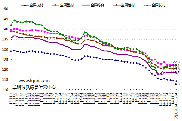 2014年第45周(2014.11.3-11.7)蘭格鋼鐵全國鋼材綜合價(jià)格指數(shù)達(dá)到118.5點(diǎn),與上周持平,較去年同期下降13.24%。其中,LGMI長材價(jià)格指數(shù)為122.4點(diǎn),較上周上升0.31%,較去年同期下降15.15%;LGMI型材價(jià)格指數(shù)為122.2點(diǎn),較上周下降0.12%,較去年同期下降12.83%;LGMI板材價(jià)格指數(shù)為114.5點(diǎn),較上周下降0.25%,較去年同期下降11.62%;LGMI管材價(jià)格指數(shù)為120.6點(diǎn),較上周下降0.05%,較去年同期下降13.02%(詳見圖1)。