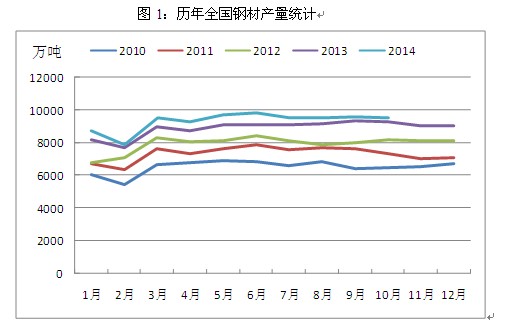 其一,鋼材產(chǎn)量增速有所回落。根據(jù)統(tǒng)計(jì),2014年1-10月,我國(guó)粗鋼產(chǎn)量68535萬(wàn)噸,同比增長(zhǎng)2.1%,增速同比減緩7.1個(gè)百分點(diǎn);鋼材產(chǎn)量93447萬(wàn)噸,增長(zhǎng)4.7%,減緩6.9個(gè)百分點(diǎn),國(guó)家政策的導(dǎo)向在這其中起了主要作用。一方面,2014年我國(guó)從政策上嚴(yán)格限制了鋼鐵等產(chǎn)能過(guò)剩行業(yè)的投資,由此導(dǎo)致除新疆地區(qū)外,其余省份全年均無(wú)高爐新建計(jì)劃,鋼鐵新增產(chǎn)能被控制;另一方面,京津冀地區(qū)持續(xù)霧霾天氣引發(fā)了公眾普遍擔(dān)憂,作為全國(guó)鋼鐵生產(chǎn)基地的河北省不時(shí)由于環(huán)境污染而被強(qiáng)制采取限產(chǎn)措施,雖然對(duì)于環(huán)保排污設(shè)施較為齊全的大型鋼廠影響有限,但中小型鋼廠的生產(chǎn)卻受到了較為明顯的影響,全國(guó)鋼材整體產(chǎn)量增速下滑也就變得順理成章
