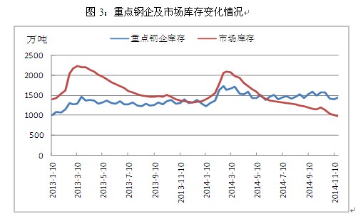 其三,鋼廠經(jīng)營(yíng)風(fēng)險(xiǎn)有所上升。由于近兩年鋼價(jià)持續(xù)大幅下跌,市場(chǎng)上的鋼貿(mào)商苦不堪言,相較于家大業(yè)大且有地方政府扶持的鋼廠,鋼貿(mào)商的日子更加難熬,在持續(xù)虧損以及資金壓力下,超半數(shù)鋼貿(mào)商選擇退出。依然活躍于市場(chǎng)的鋼貿(mào)商在操作上也不復(fù)以往的大開(kāi)大合,小心謹(jǐn)慎成為了多數(shù)鋼貿(mào)商的選擇,由此帶來(lái)的直接后果就是市場(chǎng)庫(kù)存向鋼廠庫(kù)存轉(zhuǎn)移。截止2014年10月末,全國(guó)主要城市鋼材庫(kù)存約為1043萬(wàn)噸,較2013年同期相比大幅下降25.7%,與之相反的是,此時(shí)重點(diǎn)鋼企庫(kù)存增加到1414.3萬(wàn)噸,較2013年同期上升9.8%,隨著鋼貿(mào)商 “蓄水池”功能的減弱,鋼廠對(duì)于價(jià)格調(diào)整以及生產(chǎn)策略的變動(dòng)將更為敏感,但與此同時(shí)鋼廠也將承擔(dān)更大的經(jīng)營(yíng)風(fēng)險(xiǎn)。
