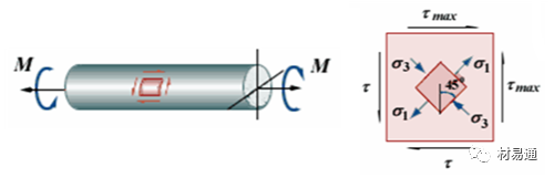 純扭轉(zhuǎn)時圓試樣的表面處于純剪應(yīng)力狀態(tài),與桿軸成±45º角的螺旋面上分別作用著兩個主應(yīng)力: σ1、σ3 并與最大剪應(yīng)力τmax絕對值數(shù)值相等。因此試樣的斷口角度直接顯示材料是拉斷還是剪斷、材料自身抗拉、抗剪能力的強(qiáng)弱由此得到直接地比較。
