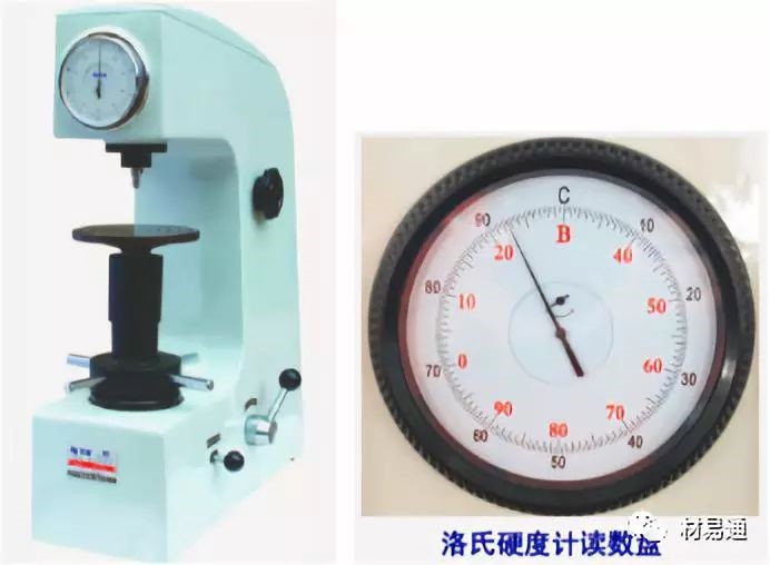原理:用金剛石圓錐或淬火鋼球壓頭,在試驗壓力F的作用下,將壓頭壓入材料表面,保持規(guī)定時間后,去除主試驗力,保持初始試驗力,用殘余壓痕深度增量計算硬度值,實際測量時,可通過試驗機(jī)的表盤直接讀出洛氏硬度的數(shù)值。