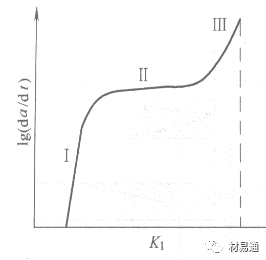 I區(qū):當K1稍大于K1SCC時,裂紋經(jīng)過一段孕育突然加速發(fā)展,即在I區(qū)內(nèi),裂紋生長速率對K1較敏感;
