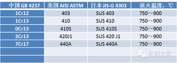 馬氏體鋼是熱裂紋敏感性鋼種,該鋼種在低溫時(shí)導(dǎo)熱率低,快速加熱時(shí)極易產(chǎn)生裂 紋,因此在處理大斷面材料時(shí),應(yīng)該先預(yù)熱,然后再快速升溫。表 5 為馬氏體不銹鋼的 參考退火溫度。