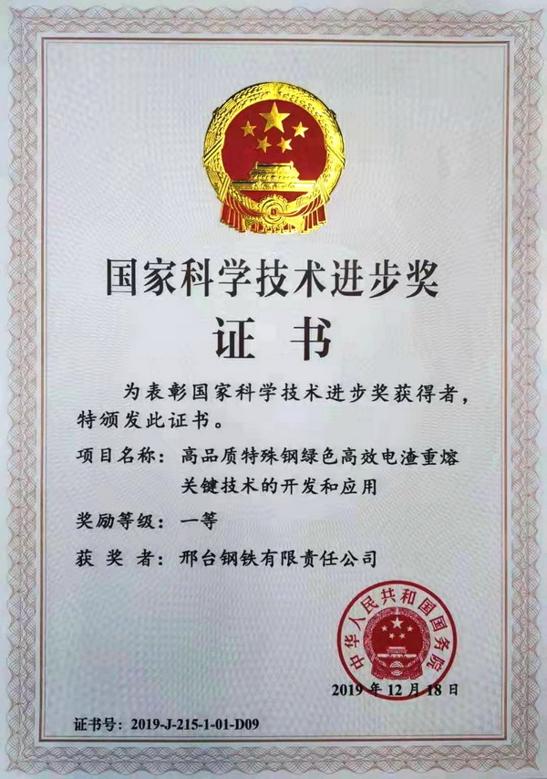 國家科技進(jìn)步獎(jiǎng)與國家自然科學(xué)獎(jiǎng)、國家技術(shù)發(fā)明獎(jiǎng)并稱國家科學(xué)技術(shù)獎(jiǎng),也稱“國家三大獎(jiǎng)”,是由國務(wù)院設(shè)立的國家級(jí)技術(shù)獎(jiǎng)項(xiàng),每年進(jìn)行一次評(píng)審。其中,一等獎(jiǎng)獎(jiǎng)勵(lì)項(xiàng)目為15%,今年全國僅有22項(xiàng)成果獲得國家科技進(jìn)步一等獎(jiǎng),邢鋼作為主要完成單位的《高品質(zhì)特殊鋼綠色高效電渣重熔關(guān)鍵技術(shù)的開發(fā)和應(yīng)用》在2019年度國家科技進(jìn)步一等獎(jiǎng)中名列榜首,公司姜方博士作為主要完成人喜獲一等獎(jiǎng)。