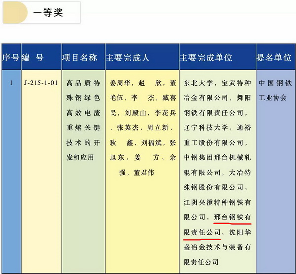 2020年1月10日,2019年度國家科學(xué)技術(shù)獎(jiǎng)勵(lì)大會(huì)在人民大會(huì)堂隆重舉行。邢鋼作為主要完成單位之一,完成的《高品質(zhì)特殊鋼綠色高效電渣重熔關(guān)鍵技術(shù)的開發(fā)和應(yīng)用》,喜獲國家科學(xué)技術(shù)進(jìn)步一等獎(jiǎng),系全國鋼鐵行業(yè)十五年來首次獲此殊榮。