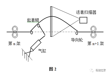 活套是用來檢測和調節(jié)相鄰機架間速度關系從而實現(xiàn)無張力軋制的設備?;钐字饕苫钐讙呙杵?、起套輥及其調節(jié)器等組成,結構如(圖2)所示。主要作用是根據檢測的套位信號來控制上游軋機的速度,實現(xiàn)自動控制系統(tǒng)。