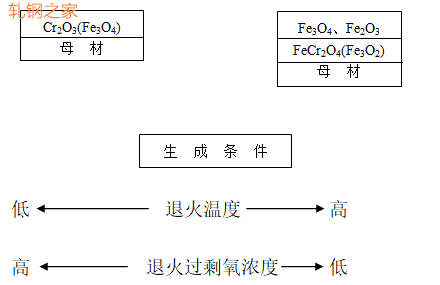 如果退火溫度高,過(guò)剩氧濃度低,則氧化鐵皮會(huì)形成雙層結(jié)構(gòu),厚度增加。退火溫度低、退火過(guò)剩氧濃度高,則氧化鐵皮為單層結(jié)構(gòu),厚度薄。