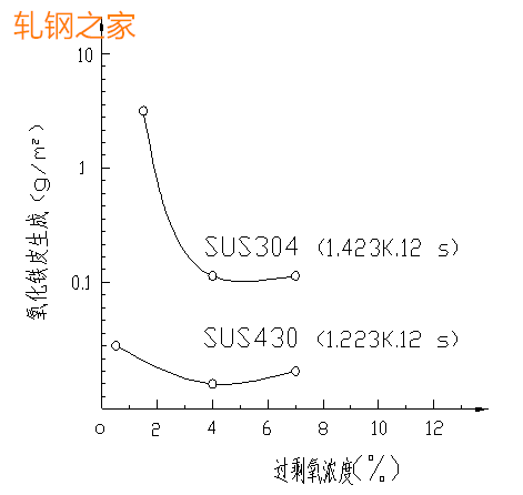 圖2:過(guò)剩氧濃度對(duì)氧化鐵皮生成量的影響
