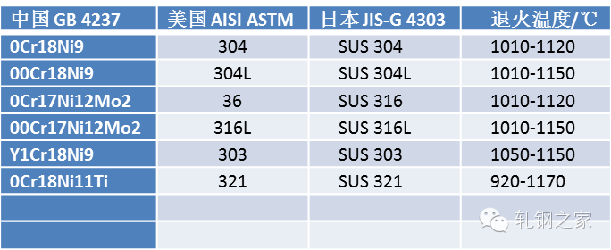 奧氏體不銹鋼的代表鋼種是 18-8 鋼(304),因為是奧氏體組織,所以具有無磁性 且沒有淬硬性等特點。由于該鋼種不發(fā)生相變,其熱處理就是加熱到高溫(一般在1000℃以上),奧氏體再結(jié)晶的同時,使在加工中產(chǎn)生的碳化物和。相分解物固溶到奧 氏體中,然后快速冷卻,使碳呈固溶狀態(tài)的奧氏體保持到常溫,這―處理過程即為固溶處理。表 1 為奧氏體不銹鋼的參考退火溫度。