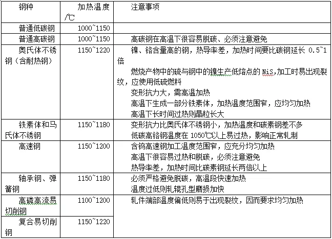 特別注意的是:對于碳鋼加熱溫度一般不能大于1300℃,大于此溫度,其一,鋼坯表面的氧化鐵皮會熔化(純氧化鐵皮的熔點(diǎn)為1377~1565℃,含有雜質(zhì)時(shí)降到1300~1350℃),從鋼表面上掉下來,露出新的表面,燒損迅速增加。其二,當(dāng)加熱溫度大于1300℃時(shí),鋼坯很有可能會出現(xiàn)過熱或過燒。生產(chǎn)其它鋼種時(shí)更應(yīng)該注意最高加熱溫度。