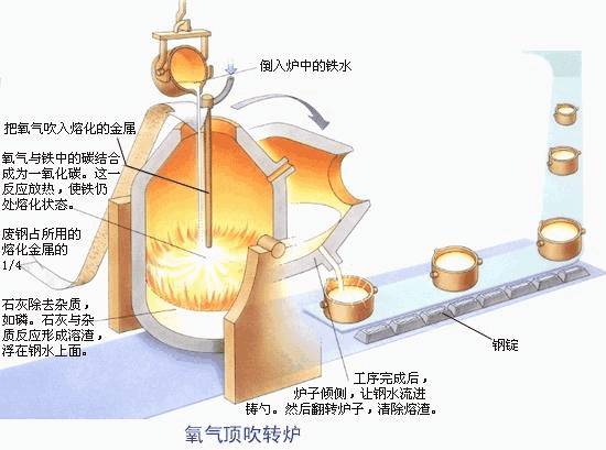 生鐵中的各種雜質(zhì),在高溫下,在不同程度上都與氧有較大的親和力。因此可以利用氧化的方法使它們成為液體、固體或氣體氧化物,液體和固體氧化物在高溫下與爐襯和加入爐內(nèi)的熔劑起作用,結(jié)合成爐渣,并在扒渣時被排除爐外,氣體也在鋼水沸騰時被CO帶到爐外。