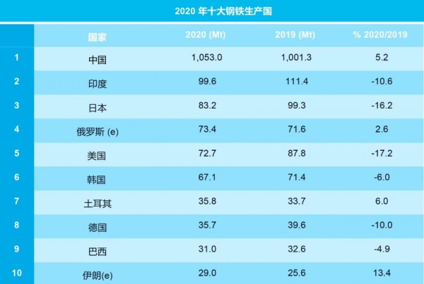 據(jù)世界鋼協(xié)統(tǒng)計(jì),2020年,全球粗鋼產(chǎn)量達(dá)到18.64億噸,同比下降0.9%。