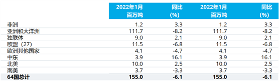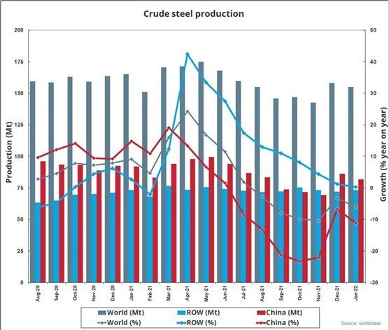 2022年1月全球64個納入世界鋼鐵協(xié)會統(tǒng)計(jì)國家的粗鋼產(chǎn)量為1.550億噸,同比下降6.1%。