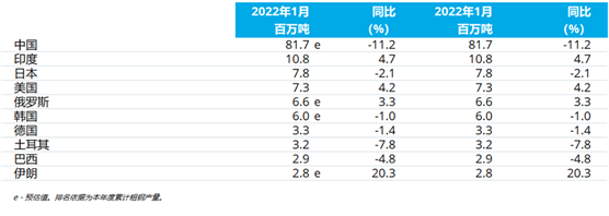 2022年1月粗鋼產(chǎn)量累計(jì)前十位的國家