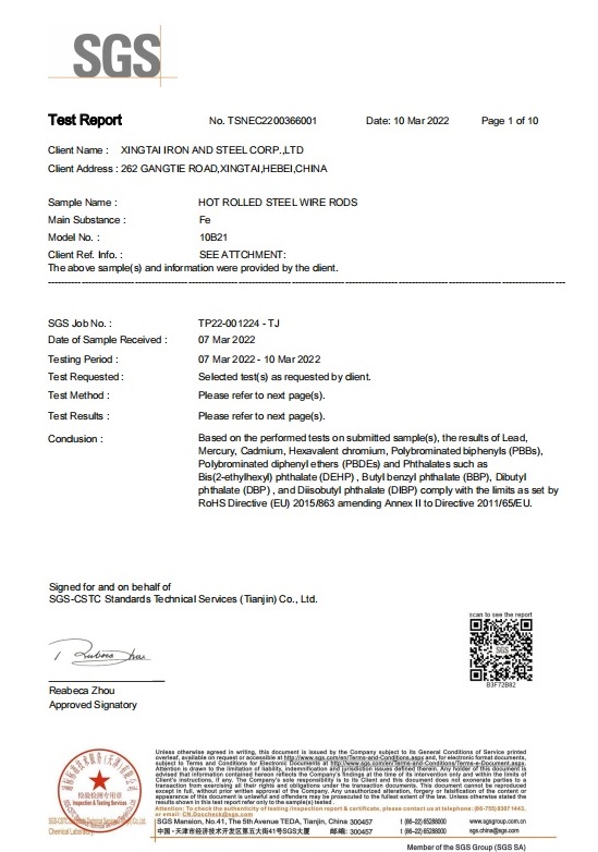 Since 2009, fasteners and special-shaped parts produced by Xingtai Steel have been used by downstream users. These products were widely used in electronic products which are exported to EU, such as instruments and apparatus. Xingtai Steel carries out this inspection and got the qualified result every time. That shows that the wire products of Xingtai Steel have a strong guarantee for quality safety and can meet the EU requirement.