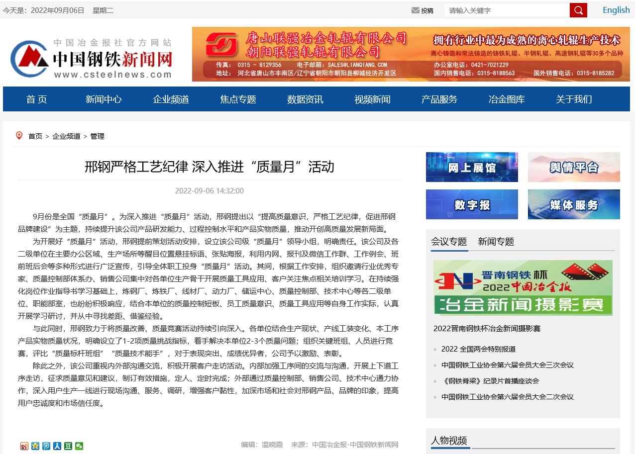 9月份是全國(guó)“質(zhì)量月”。為深入推進(jìn)“質(zhì)量月”活動(dòng),邢鋼提出以“提高質(zhì)量意識(shí),嚴(yán)格工藝紀(jì)律,促進(jìn)邢鋼品牌建設(shè)”為主題,持續(xù)提升該公司產(chǎn)品研發(fā)能力、過(guò)程控制水平和產(chǎn)品實(shí)物質(zhì)量,推動(dòng)開(kāi)創(chuàng)高質(zhì)量發(fā)展新局面。