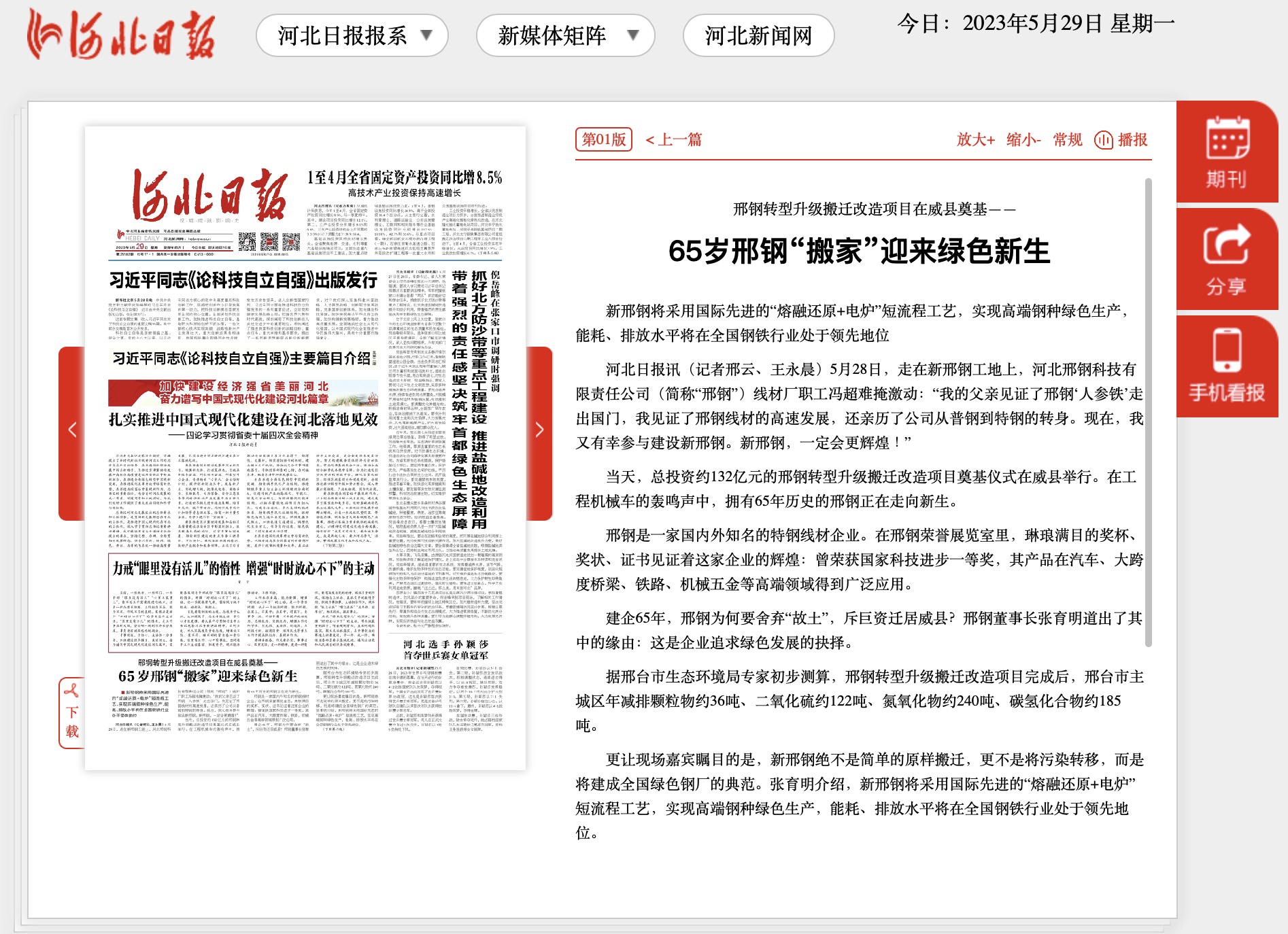 當天,總投資約132億元的邢鋼轉(zhuǎn)型升級搬遷改造項目奠基儀式在威縣舉行。在工程機械車的轟鳴聲中,擁有65年歷史的邢鋼正在走向新生。