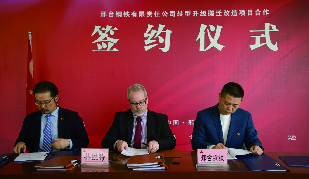 圖為普銳特冶金技術(shù)中國副總裁佐野洋一、普銳特冶金技術(shù)美國執(zhí)行COO Robert Lesage 與邢鋼董事長張育明簽訂軋機設(shè)備合同。 (普銳特冶金技術(shù))