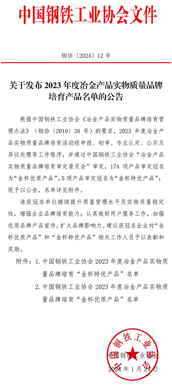 2024年1月24日,中國(guó)鋼鐵工業(yè)協(xié)會(huì)發(fā)布2023年度冶金產(chǎn)品實(shí)物質(zhì)量品牌培育產(chǎn)品名單公告,邢臺(tái)鋼鐵申報(bào)的《冷鐓和冷擠壓用熱軋盤(pán)條ML08Al》和《冷鐓和冷擠壓用熱軋盤(pán)條ML20MnTiB》獲冶金產(chǎn)品實(shí)物質(zhì)量品牌培育“金杯優(yōu)質(zhì)產(chǎn)品”。 至此,在合金冷墩鋼、簾線鋼、軸承鋼、焊接用鋼、預(yù)應(yīng)力、易切削鋼、耐候鋼種等應(yīng)用領(lǐng)域,邢鋼共有近50個(gè)產(chǎn)品獲此殊榮,這標(biāo)志著公司高端鋼種產(chǎn)品實(shí)物質(zhì)量達(dá)到了國(guó)際同類產(chǎn)品實(shí)物水平。