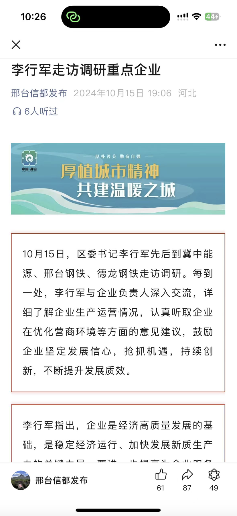 10月15日,區(qū)委書記李行軍先后到冀中能源、邢臺鋼鐵、德龍鋼鐵走訪調(diào)研。每到一處,李行軍與企業(yè)負責人深入交流,詳細了解企業(yè)生產(chǎn)運營情況,認真聽取企業(yè)在優(yōu)化營商環(huán)境等方面的意見建議,鼓勵企業(yè)堅定發(fā)展信心,搶抓機遇,持續(xù)創(chuàng)新,不斷提升發(fā)展質(zhì)效。