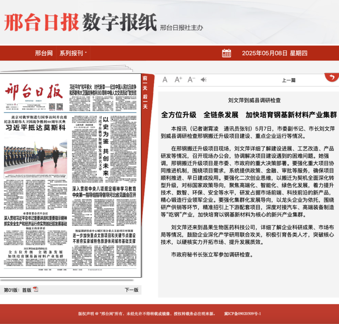 在邢鋼搬遷升級(jí)項(xiàng)目現(xiàn)場(chǎng),劉文萍詳細(xì)了解建設(shè)進(jìn)展、工藝改造、產(chǎn)品研發(fā)等情況,召開現(xiàn)場(chǎng)辦公會(huì),協(xié)調(diào)解決項(xiàng)目建設(shè)遇到的困難問(wèn)題。她強(qiáng)調(diào),邢鋼搬遷升級(jí)項(xiàng)目是市委、市政府的重大決策部署。要強(qiáng)化重大項(xiàng)目協(xié)同推進(jìn)機(jī)制,圍繞項(xiàng)目需求,系統(tǒng)提供政策、金融、審批等服務(wù),確保項(xiàng)目順利推進(jìn)、早日建成投用。要強(qiáng)化二次創(chuàng)業(yè)思維,以搬遷為契機(jī)全面深化轉(zhuǎn)型升級(jí),對(duì)標(biāo)國(guó)家政策導(dǎo)向,聚焦高端化、智能化、綠色化發(fā)展,著力提升技術(shù)、數(shù)智、環(huán)保、安全等水平,研發(fā)占據(jù)市場(chǎng)前端、科技前沿的新產(chǎn)品,精心鍛造行業(yè)領(lǐng)軍企業(yè)。要強(qiáng)化集群化發(fā)展導(dǎo)向,以龍頭企業(yè)為依托,圍繞研產(chǎn)供銷等環(huán)節(jié),精準(zhǔn)招引上下游配套項(xiàng)目,深度對(duì)接汽車、高端裝備制造等“吃鋼”產(chǎn)業(yè),加快培育以鋼基新材料為核心的新興產(chǎn)業(yè)集群。