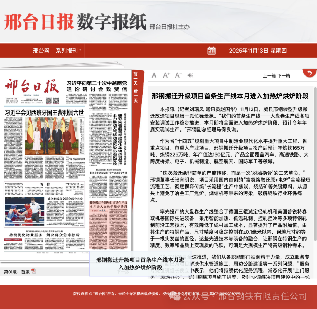 率先投產(chǎn)的大盤(pán)卷生產(chǎn)線整合了德國(guó)三輥減定徑軋機(jī)和美國(guó)普銳特卷取機(jī)等國(guó)際先進(jìn)裝備,采用智能加熱、低溫軋制、控軋控冷等多項(xiàng)特鋼軋制前沿工藝技術(shù),有效降低了線材加工成本,顯著提升了產(chǎn)品附加值。由其生產(chǎn)的特鋼產(chǎn)品,尺寸精度可穩(wěn)定控制在±0.1毫米以?xún)?nèi),誤差尺寸約等于一根頭發(fā)絲的直徑。這些先進(jìn)技術(shù)與裝備的融合,讓邢鋼在特鋼生產(chǎn)的精度、效率和品質(zhì)上實(shí)現(xiàn)質(zhì)的飛躍,可滿(mǎn)足大規(guī)模生產(chǎn)特高級(jí)鋼種需求。“為了讓項(xiàng)目全速推進(jìn),我們從各職能部門(mén)抽調(diào)精干力量,成立服務(wù)專(zhuān)班,前期已為項(xiàng)目解決供水管道施工、周邊公路建設(shè)等一系列問(wèn)題。”服務(wù)專(zhuān)班值班組長(zhǎng)侯立中表示,他們將持續(xù)優(yōu)化服務(wù)流程,常態(tài)化開(kāi)展“上門(mén)服務(wù)”“現(xiàn)場(chǎng)辦公”,實(shí)時(shí)跟蹤項(xiàng)目施工進(jìn)度,及時(shí)協(xié)調(diào)解決項(xiàng)目建設(shè)中的一線難題,保障項(xiàng)目按時(shí)間節(jié)點(diǎn)高效推進(jìn),早日建成投產(chǎn)。“眼下,我們正對(duì)標(biāo)國(guó)內(nèi)首鋼智新等先進(jìn)企業(yè),瞄準(zhǔn)高強(qiáng)度耐熱鋼等八大系列的高精尖產(chǎn)品,加大科技研發(fā)投入力度,全面提升產(chǎn)品附加值,實(shí)現(xiàn)高端化、綠色化、智能化升級(jí),為我國(guó)高端裝備制造業(yè)提供關(guān)鍵材料支撐。”馬保良說(shuō)。